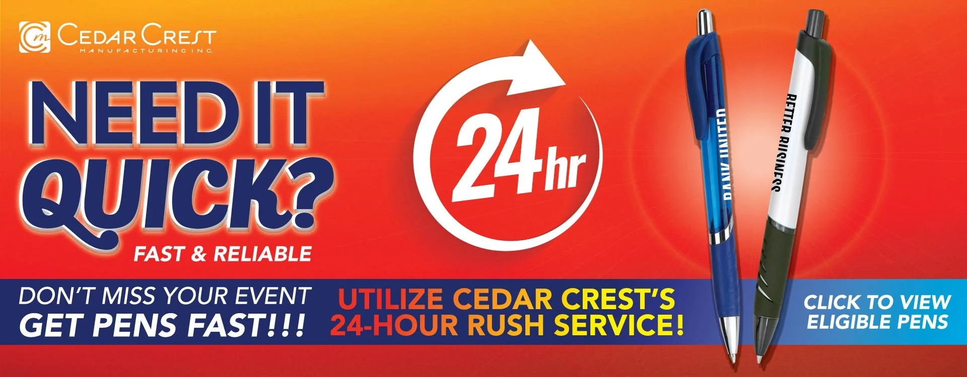 Cedar Crest Manufacturing is a promotional pen provider building on more than 80 years prior experience in the promotional writing instrument business. The Cedar Crest line consists of excellent writing pens in the retail price range of $.20 to $2.44. No setup charges combined with superior quality imprints and outstanding customer service make this line nearly impossible to beat.